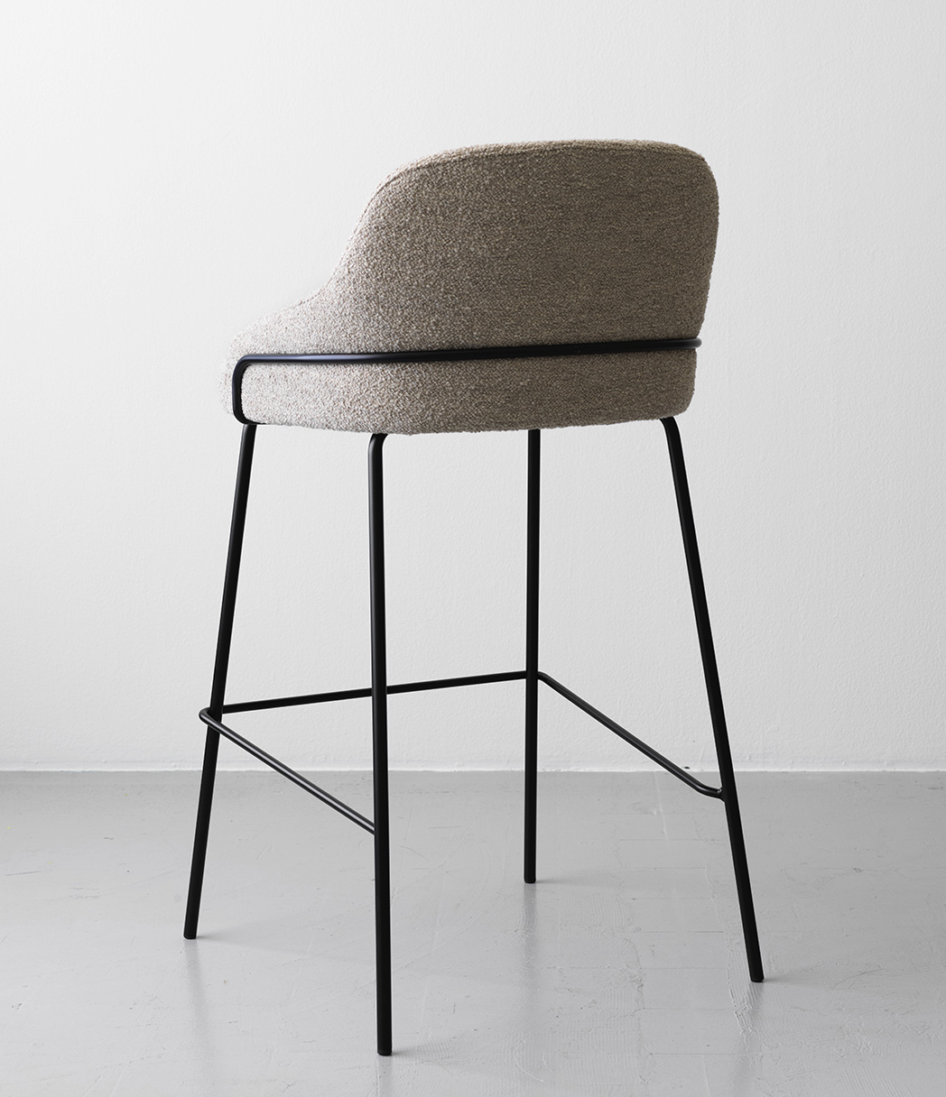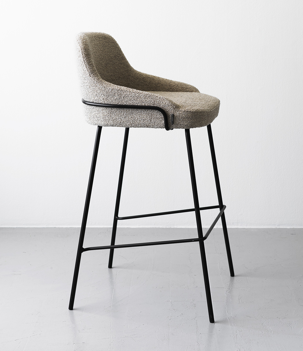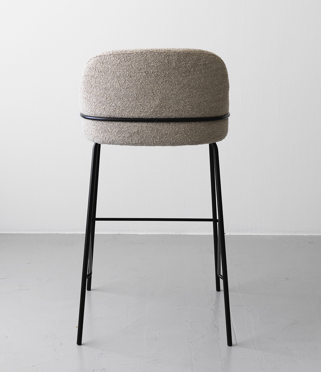 Cookie Bar High Back är en klädd barstol med modernt uttryck. Både sits och rygg har bra stoppning så att man sitter bekvämt. Barstolens metallben omsluter ryggen med sina mjuka former.